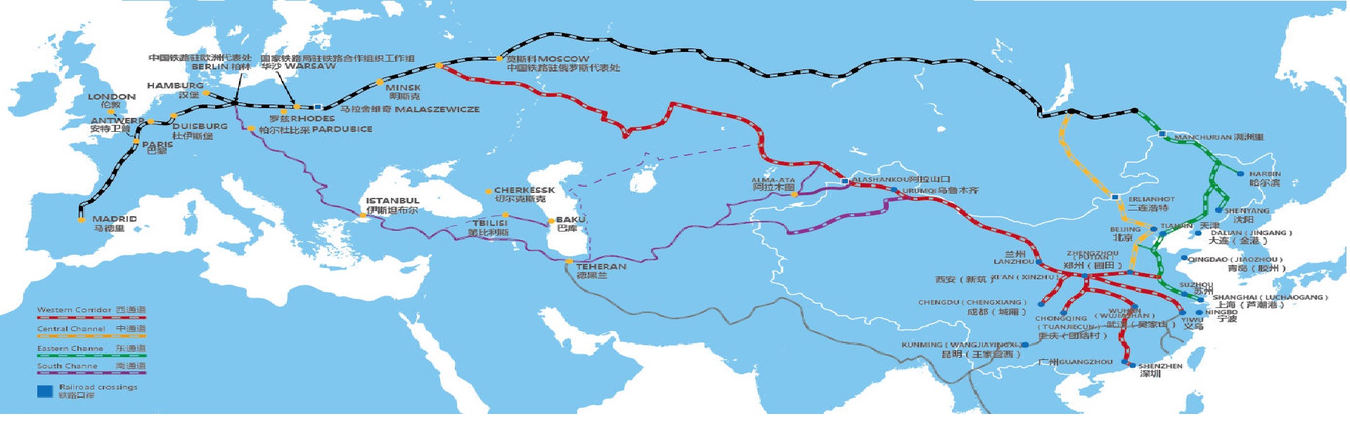 经阿拉山口/多斯特克和霍尔果斯/阿腾科里转关换装,到达欧洲境内各主要站
